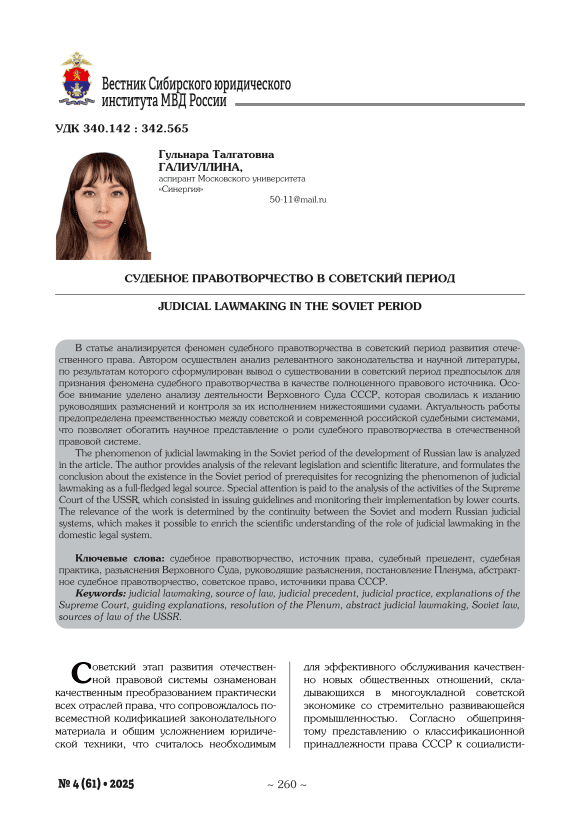 В статье анализируется феномен судебного правотворчества в советский период развития отече- ственного права. Автором осуществлен анализ релевантного законодательства и научной литературы, по результатам которого сформулирован вывод о существовании в советский период предпосылок для признания феномена судебного правотворчества в качестве полноценного правового источника. Осо- бое внимание уделено анализу деятельности Верховного Суда СССР, которая сводилась к изданию руководящих разъяснений и контроля за их исполнением нижестоящими судами. Актуальность работы предопределена преемственностью между советской и современной российской судебными системами, что позволяет обогатить научное представление о роли судебного правотворчества в отечественной правовой системе.