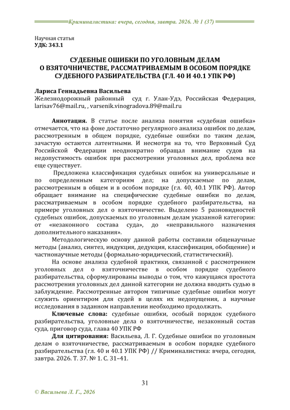 В статье после анализа понятия «судебная ошибка» отмечается, что на фоне достаточно регулярного анализа ошибок по делам, рассмотренным в общем порядке, судебные ошибки по делам, рассмотренным в особом порядке, зачастую остаются латентными. И, несмотря на то, что Верховный Суд Российской Федерации неоднократно обращал внимание судов на недопустимость ошибок при рассмотрении уголовных дел, проблема все еще присутствует. Предложена классификация судебных ошибок на универсальные и по определенным категориям дел; на допускаемые по делам, рассмотренным в общем и в особом порядке (гл. 40, 40.1 УПК РФ). Автор обращает внимание на специфические судебные ошибки по делам, рассматриваемым в особом порядке судебного разбирательства, на примере уголовных дел о взяточничестве. Выделено 5 разновидностей судебных ошибок, допускаемых по уголовным делам указанной категории: от «незаконного состава суда», до «неправильного назначения дополнительного наказания». Методологическую основу данной работы составили общенаучные методы (анализ, синтез, индукция, дедукция, классификация, обобщение) и частнонаучные методы (формально-юридический, статистический). На основе анализа судебной практики, связанной с рассмотрением уголовных дел о взяточничестве в особом порядке судебного разбирательства, сформулированы выводы о том, что кажущаяся простота рассмотрения уголовных дел данной категории не должна вводить судью в заблуждение. Предложенные автором типичные судебные ошибки могут служить ориентиром для судей в целях их недопущения, а научные исследования в заданном направлении необходимо продолжать.