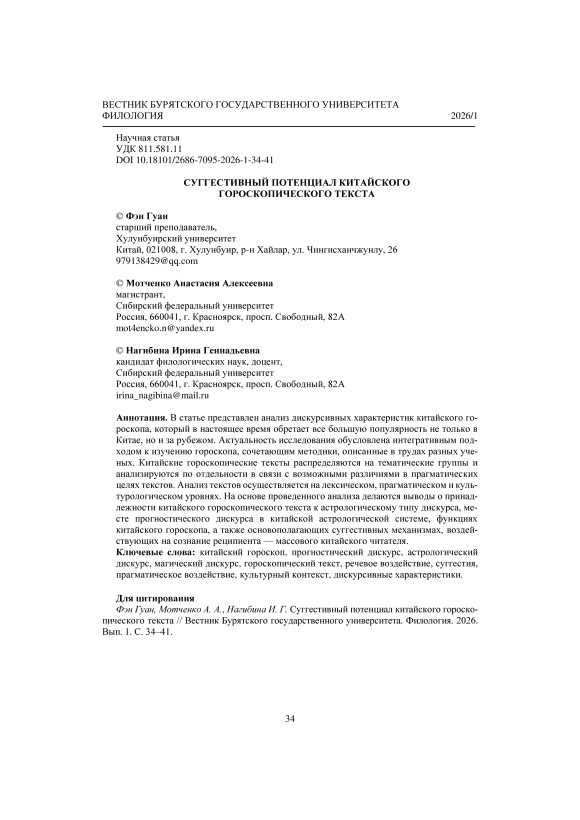В статье представлен анализ дискурсивных характеристик китайского гороскопа, который в настоящее время обретает все большую популярность не только в Китае, но и за рубежом. Актуальность исследования обусловлена интегративным подходом к изучению гороскопа, сочетающим методики, описанные в трудах разных ученых. Китайские гороскопические тексты распределяются на тематические группы и анализируются по отдельности в связи с возможными различиями в прагматических целях текстов. Анализ текстов осуществляется на лексическом, прагматическом и культурологическом уровнях. На основе проведенного анализа делаются выводы о принадлежности китайского гороскопического текста к астрологическому типу дискурса, месте прогностического дискурса в китайской астрологической системе, функциях китайского гороскопа, а также основополагающих суггестивных механизмах, воздействующих на сознание реципиента — массового китайского читателя.