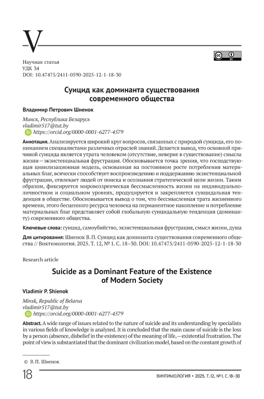 Анализируется широкий круг вопросов, связанных с природой суицида, его пониманием специалистами различных отраслей знаний. Делается вывод, что основной причиной суицида является утрата человеком (отсутствие, неверие в существование) смысла жизниэкзистенциальная фрустрация. Обосновывается точка зрения, что господствующая цивилизационная модель, основанная на постоянном росте потребления материальных благ, всячески способствует воспроизведению и поддержанию экзистенциальной фрустрации, отвлекает людей от поиска и осознания стратегической цели жизни. Таким образом, фиксируется мировоззренческая бессмысленность жизни на индивидуально-личностном и социальном уровнях, продуцируется и закрепляется суицидальная тенденция в обществе. Обосновывается вывод о том, что бессмысленная трата жизненного времени, этого бесценного ресурса человека на перманентное накопление и потребление материальных благ представляет собой глобальную суицидальную тенденция (доминанту) современного общества.