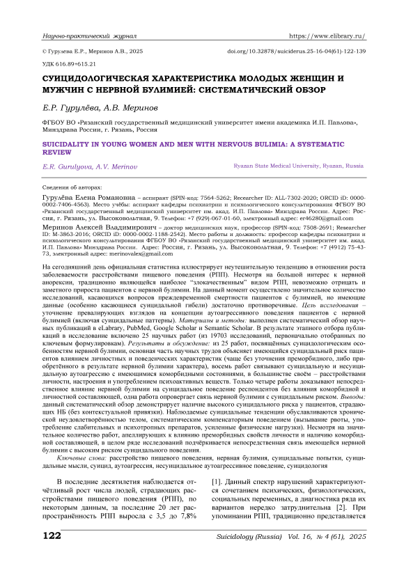 На сегодняшний день официальная статистика иллюстрирует неутешительную тенденцию в отношении роста заболеваемости расстройствами пищевого поведения (РПП). Несмотря на большой интерес к нервной анорексии, традиционно являющейся наиболее “злокачественным” видом РПП, невозможно отрицать и заметного прироста пациентов с нервной булимии. На данный момент осуществлено значительное количество исследований, касающихся вопросов преждевременной смертности пациентов с булимией, но имеющие данные (особенно касающиеся суицидальной гибели) достаточно противоречивые. Цель исследования – уточнение превалирующих взглядов на концепции аутоагрессивного поведения пациентов с нервной булимией (включая суицидальные паттерны). Материалы и методы: выполнен систематический обзор научных публикаций в eLabrary, PubMed, Google Scholar и Semantic Scholar. В результате этапного отбора публикаций в исследование включено 25 научных работ (из 19703 исследований, первоначально отобранных по ключевым формулировкам). Результаты и обсуждение: из 25 работ, посвящённых суицидологическим особенностям нервной булимии, основная часть научных трудов объясняет имеющийся суицидальный риск пациентов влиянием личностных и поведенческих характеристик (чаще без уточнения преморбидного, либо приобретённого в результате нервной булимии характера), восемь работ связывают суицидальную и несуицидальную аутоагрессию с имеющимися коморбидными состояниями, в большинстве своём – расстройствами личности, настроения и употреблением психоактивных веществ. Только четыре работы доказывают непосредственное влияние нервной булимии на суицидальное поведение респондентов без влияния коморбидной и личностной составляющей, одна работа опровергает связь нервной булимии с суицидальным риском. Выводы: данный систематический обзор демонстрирует наличие высокого суицидального риска у пациентов, страдающих НБ (без контекстуальной привязки). Наблюдаемые суицидальные тенденции обуславливаются хронической неудовлетворённостью телом, систематическим компенсаторным поведением (вызывание рвоты, употребление слабительных и психотропных препаратов, усиленные физические нагрузки). Несмотря на значительное количество работ, апеллирующих к влиянию преморбидных свойств личности и наличию коморбидной составляющей, в целом ряде исследований подчёркивается непосредственная связь имеющейся нервной булимии с высоким риском суицидального поведения.