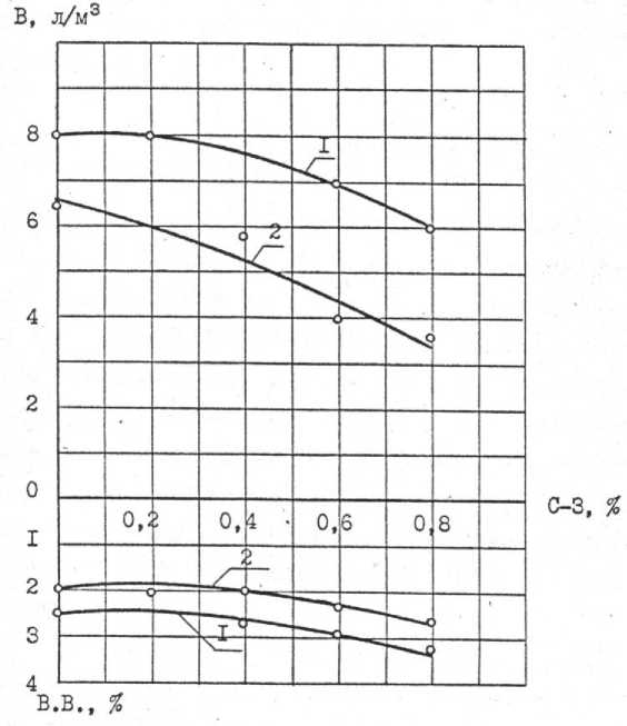 Рисунок 4. Влияние дозировки суперпластификатора С-3 на водоотделение и воздухововлечение бетонной смеси при расходе цемента: 1 – 280; 2 – 400 кг/м3