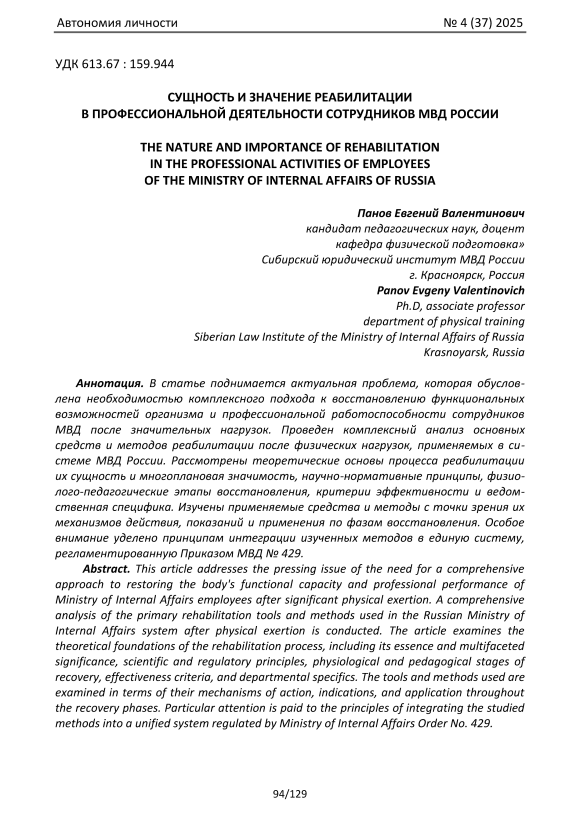 В статье поднимается актуальная проблема, которая обусловлена необходимостью комплексного подхода к восстановлению функциональных возможностей организма и профессиональной работоспособности сотрудников МВД после значительных нагрузок. Проведен комплексный анализ основных средств и методов реабилитации после физических нагрузок, применяемых в системе МВД России. Рассмотрены теоретические основы процесса реабилитации их сущность и многоплановая значимость, научно-нормативные принципы, физиолого-педагогические этапы восстановления, критерии эффективности и ведомственная специфика. Изучены применяемые средства и методы с точки зрения их механизмов действия, показаний и применения по фазам восстановления. Особое внимание уделено принципам интеграции изученных методов в единую систему, регламентированную Приказом МВД № 429.