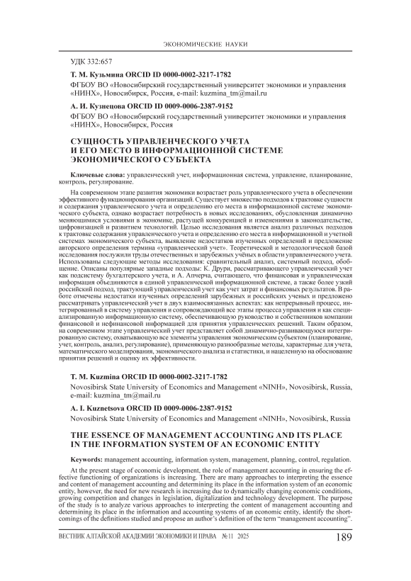 На современном этапе развития экономики возрастает роль управленческого учета в обеспечении эффективного функционирования организаций. Существует множество подходов к трактовке сущности и содержания управленческого учета и определению его места в информационной системе экономического субъекта, однако возрастает потребность в новых исследованиях, обусловленная динамично меняющимися условиями в экономике, растущей конкуренцией и изменениями в законодательстве, цифровизацией и развитием технологий. Целью исследования является анализ различных подходов к трактовке содержания управленческого учета и определению его места в информационной и учетной системах экономического субъекта, выявление недостатков изученных определений и предложение авторского определения термина «управленческий учет». Теоретической и методологической базой исследования послужили труды отечественных и зарубежных учёных в области управленческого учета. Использованы следующие методы исследования: сравнительный анализ, системный подход, обобщение. Описаны популярные западные подходы: К. Друри, рассматривающего управленческий учет как подсистему бухгалтерского учета, и А. Апчерча, считающего, что финансовая и управленческая информация объединяются в единой управленческой информационной системе, а также более узкий российский подход, трактующий управленческий учет как учет затрат и финансовых результатов. В работе отмечены недостатки изученных определений зарубежных и российских ученых и предложено рассматривать управленческий учет в двух взаимосвязанных аспектах: как непрерывный процесс, интегрированный в систему управления и сопровождающий все этапы процесса управления и как специализированную информационную систему, обеспечивающую руководство и собственников компании финансовой и нефинансовой информацией для принятия управленческих решений. Таким образом, на современном этапе управленческий учет представляет собой динамично-развивающуюся интегрированную систему, охватывающую все элементы управления экономическим субъектом (планирование, учет, контроль, анализ, регулирование), применяющую разнообразные методы, характерные для учета, математического моделирования, экономического анализа и статистики, и нацеленную на обоснование принятия решений и оценку их эффективности.