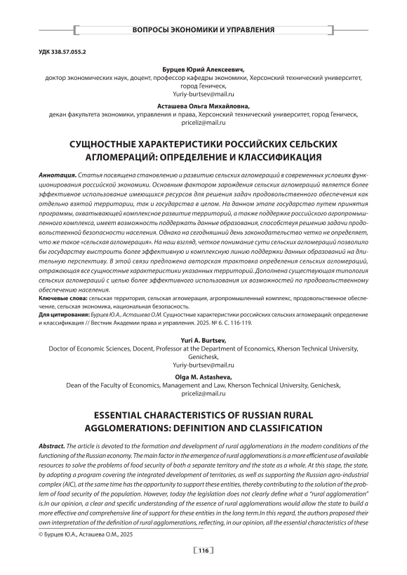Сельская территория, сельская агломерация, агропромышленный комплекс, продовольственное обеспечение, сельская экономика, национальная безопасность