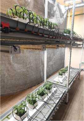 Растения томата выращивали гидропонным способом по малообъемной технологии на минераловатном субстрате с капельным поливом в фитокомнате производства Федерального научного агроинженерного центра «ВИМ» (Москва, Россия) (рис.).