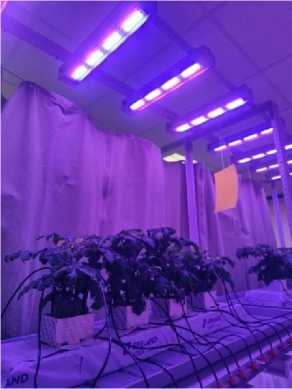 В качестве источника света была использована усовершенствованная система освещения, разработанная специалистами ФНАЦ ВИМ. За 14 дней до уборки урожая плодов томата в экспериментальных вариантах (3 и 4) одновременно с основным белым освещением дополнительно включались синие (Blue-P-hLL) и красные (Red-P-hLL) светодиоды (с 5:00 до 21:00) на протяжении 16 ч в сут.