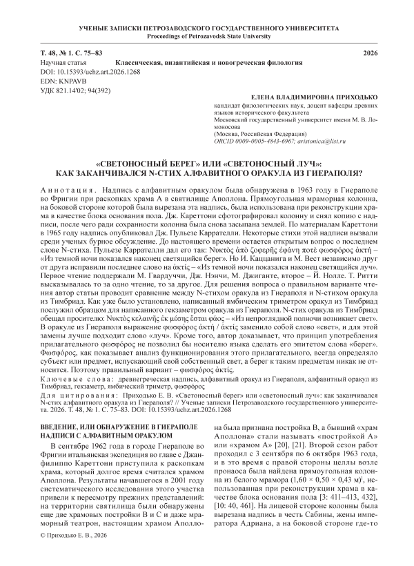 «Светоносный берег» или «светоносный луч»: как заканчивался Ν-стих алфавитного оракула из Гиераполя?