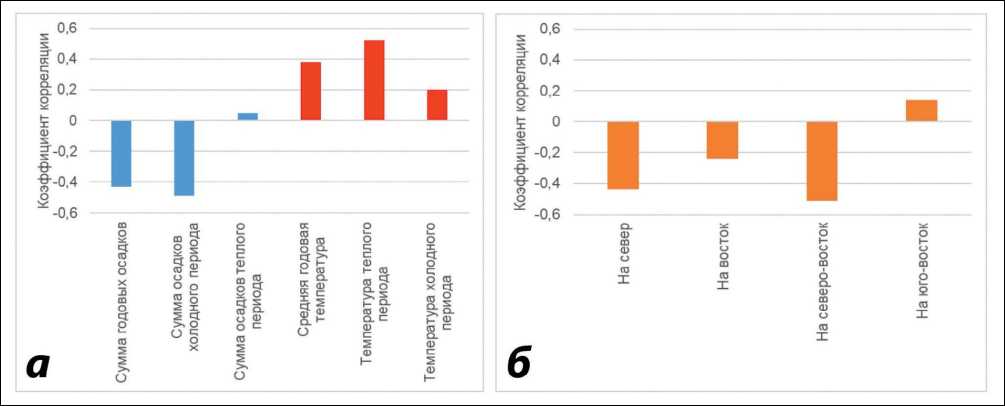 Fig. 2. Relationships between pine forests NDVI, climate indicators (a) and geographical directions (b) in the Lower Amur region ний – 140 мм и 14,5 °С при средних показателях для региона 220 мм и 12,4 °С. Кроме того, климат данной части региона отличается континентальностью, за счет чего наиболее приближен к климатическим условиям Сибири, где сосна обыкновенная распространена повсеместно [5]. Годовая амплитуда температур воздуха здесь составляет 46 °С, что на 5 °С больше, чем в среднем для Нижнего Приамурья [1].