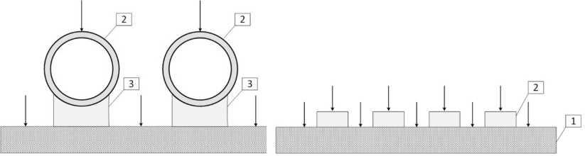 Fig. 1. Test schemes: a – test scheme No. 1; b – test scheme No. 2; 1 – heating surface, 2 – test sample; 3 – substrate; the arrow indicates the temperature control locations