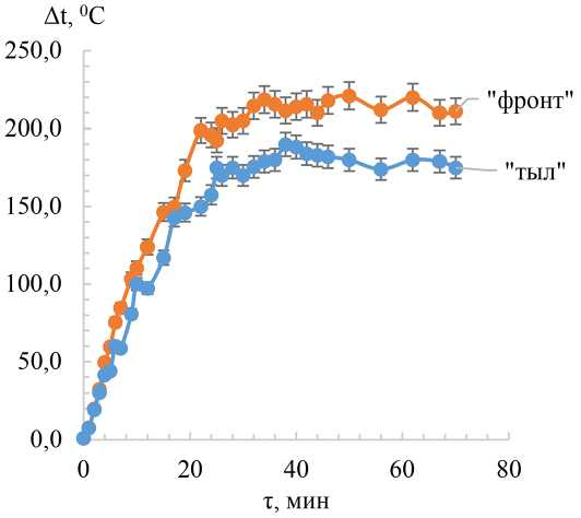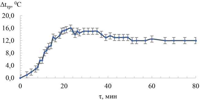 По полученным данным построен график разницы температур исследуемых образцов от времени нагрева (рис. 3). Максимальный градиент температур между сравниваемыми трубами фиксируется после начала нагрева в течение 13÷19 мин. В этот период времени у трубы