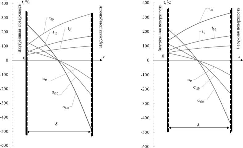 По приведенным формулам (2)-(4) построены эпюры распределения температур и термических напряжений в стенке образцов «фронт» (рис. 5а) и «тыл» (рис. 5б) для разных моментов времени – 5, 10, 70 мин. Анализ полученных расчетно-экспериментальных данных показал, что внутренняя поверхность испытывает при прогреве напряжения растяжения, а наружная – сжатия. При этом пиковая нагрузка, соответствующая наибольшей разнице между напряжениями на поверхностях «фронт» и «тыл», наблюдается в начальный момент прогрева при τ=5 мин (σtвн (ф ронт ) =67,4 МПа, σtвн ( тыл ) =49,9 МПа, σtн (ф ронт ) = –134,9 МПа и σtн ( тыл ) = –99,9 МПа). Эта разница при τ=5 мин составляет 35 %, далее по мере прогрева уменьшается до 10 %.
