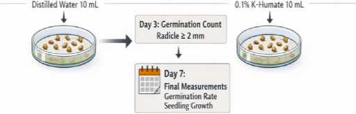 Germination at day 3. Day-3 germination percentages were 59.2 % in the DI water control and 56.0 % in 0.1 % K-humate (Table 2). Under the applied criterion (radicle length ≥ 2 mm), the difference was small, suggesting that K-humate had no clear promotive effect on early germination.