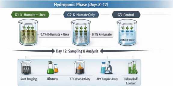 The present study used a two-phase workflow (germination followed by short-term hydroponics) to evaluate the effects of potassium humate (K-humate) and its combination with urea on wheat performance. We asked three questions: (i) does 0.1 % K-humate influence early germination (day 3)? (ii) does K-humate alter seedling root surface area and biomass at day 12, and are effects enhanced when urea is supplied? and (iii) do biochemical indicators (TTC reduction, APX activity, chlorophyll concentration) suggest physiological mechanisms associated with the observed growth patterns? We hypothesized that K-humate would have limited impact on early germination but would promote root surface area more strongly when paired with urea, and that accelerated growth would coincide with elevated antioxidant enzyme activity.