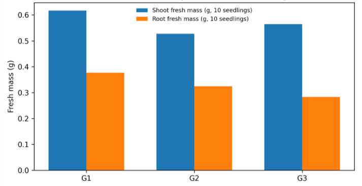 Seedling fresh biomass at day 12. Shoot and root fresh mass at day 12 (sum of 10 seedlings per treatment) indicated the highest biomass accumulation in G1 (Table 3; Figure 2). Compared with the DI water control (G3), G1 increased shoot fresh mass and markedly increased root fresh mass, consistent with enhanced root development under K-humate + urea.