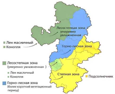 Сочетание различных климатических зон внутри одного региона формирует потенциал для диверсификации масличного производства. В степной зоне приоритетным остается подсолнечник, в лесостепной – лен, а конопля может эффективно интегрироваться в системы севооборота в зонах умеренного увлажнения. Такое распределение снижает риски монокультурного земледелия и повышает устойчивость аграрной системы.