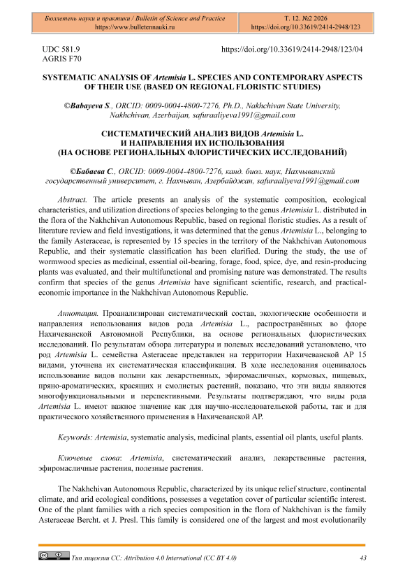 The Nakhchivan Autonomous Republic, characterized by its unique relief structure, continental climate, and arid ecological conditions, possesses a vegetation cover of particular scientific interest. One of the plant families with a rich species composition in the flora of Nakhchivan is the family Asteraceae Bercht. et J. Presl. This family is considered one of the largest and most evolutionarily advanced among dicotyledonous plants in terms of species diversity. Representatives of the Asteraceae family include annual, biennial, and perennial herbs, as well as subshrubs. Members of the family are mainly distributed in open, sunny areas, dry and semi-desert landscapes, which indicates their high ecological plasticity. One of the largest and most polymorphic genera of the family Asteraceae is the genus Artemisia L. Among the xerophytic and semi-xerophytic plants distributed in the region, species of the genus Artemisia have a wide range of distribution and high adaptive capacity. Wormwood species play a key role as major components of phytocenoses in the desert, semi-desert, and foothill landscapes of Nakhchivan. These plants are important in preventing soil erosion, conserving biodiversity, and forming natural forage areas. At the same time, Artemisia species serve as ecological indicator plants and are valuable for studying the history of landscape formation. The floristic richness and natural isolation of the Nakhchivan territory allow for clearer observation of the morphological and ecological variability of the genus Artemisia. Therefore, the distribution and utilization aspects of the genus Artemisia in the flora of Nakhchivan have long been the focus of scientific research. Among useful plants, species belonging to the genus Artemisia L. are of particular importance. Based on numerous studies and literature sources, it has been established that species of this genus are used as medicinal, food and forage, essential oil-bearing, dye, resinproducing, and spice plants. These characteristics confirm the multifunctionality of Artemisia species and their high economic and scientific significance in the region, especially as medicinal, essential oil-bearing, and forage plants.