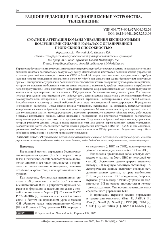 Управление беспилотными воздушными судами от первого лица требует передачи команд управления от станции внешнего пилота к беспилотному воздушному судну. Использование протоколов передачи команд управления и телеметрической информации, таких как CRSF и MavLink, через пакетные сети передачи данных требует наличия полосы пропускания канала связи более 50 Кбит/с для управления одним беспилотным воздушным судном. Одновременное управление большим количеством беспилотных воздушных судов в удаленных районах, которые не покрыты мобильными сетями связи последних поколений, требует уменьшения потребляемой полосы пропускания. Целью настоящего исследования является сокращение необходимой полосы пропускания канала связи при передаче потока команд FPV-управления беспилотного воздушного судна. Сокращение полосы пропускания достигается за счет нейросетевого сжатия команд управления с дополнительным блоком помехоустойчивого кодирования и их последующей агрегации. Рассматриваются коды Рида-Соломона. Разрабатывается архитектура новой нейронной сети вида «вариационный автокодировщик». В результате исследования разработан метод сжатия команд управления, основанный на агрегации, помехоустойчивом кодировании и сжатии нейронной сетью вида «автокодировщик». Метод отличается от существующих тем, что для компенсации сжатия автокодировщиком с потерями применяются помехоустойчивые коды, работающие в режиме исправления ошибок. Метод пригоден к применению для протоколов управления беспилотным воздушным судном через пакетные сети передачи данных. Представлен нейросетевой кодек команд управления, который реализует данный метод, а также нейронная сеть для сжатия агрегированных команд управления. Разработанный метод обеспечивает сжатие команд управления протокола CRSF на 18,75% и, как следствие, уменьшает необходимую полосу пропускания канала связи при FPV-управлении. Результаты могут быть обобщенно применены и к другим протоколам управления.