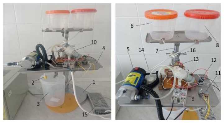 1– штатив; 2 – ортадан тепкіш форсунка; 3 – контейнер (ерітіндіге арналған); 4 – қозғағыш панел; 5 – тісті сорғы; 6 – қоспаға арналған контейнер; 7 – реттегіш гайка; 8 – контейнер (шаюға арналған); 9 – бір фазалы қатты күйдегі реле; 10 – айналым сорғысы; 11 – айнымалы сым резисторлары; 12 – тұрақты кернеуді төмендететін тұрақтандырғыш; 13 – термостат, 14 – құбырлар, 15 – қуат көзі.