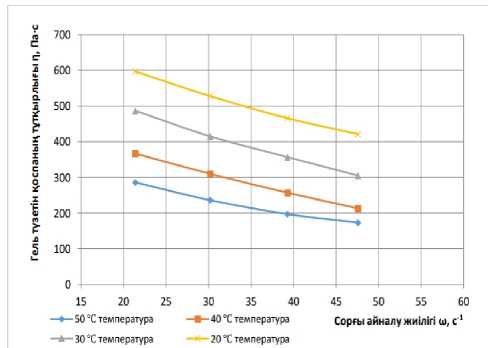 Гель түзетін қоспаның сулы ерітіндісінің тұтқырлығын анықтау. Капсулалар алу үшін тәжірибелік қондырғыда 8-суретте көрсетіл-гендей тісті сорғының айналу жиілігі мен ерітінді температурасынан, гель түзетін қоспаның тұтқырлығының тәуелділігі, гель түзетін қоспаның температурасы көтерілуімен тұтқырлығы төмендейтіндігі көрінеді, бұл ретте 40°С және 50°С температурада тұтқырлығы шамалы өзгереді, мұны ескере отырып, 40°С температурасын неғұрлым қолайлы деп қабылдауға болады.