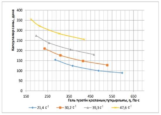 9-суретте көрсетілгендей тісті сорғының әр түрлі айналу жиілігінде алынатын капсулалар санының гель түзетін қоспаның тұтқырлығына тәуелділігі, гель түзетін қоспаның тұтқырлығының азаюымен алынатын капсулалардың саны артатыны көрінеді. Тісті сорғының 47,6 с-1 айналу жиілігі оңтайлы болды, себебі алынған капсулалар саны артты. Мұны тұтқырлықтың төмендеуі кезінде гель түзетін қоспаның тығыздығы және тиісінше уақыт бірлігінде ортадан тепкіш форсунка тесігі арқылы өтетін сұйықтықтың көлемі артуымен түсіндіруге болады [14, 15].