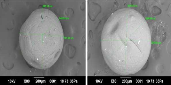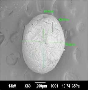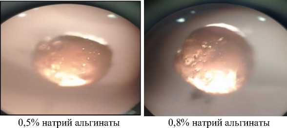 1% альгинат концентрациясында тұтқыр-лығы жоғары болуына байланысты алынған капсулалар, дөңгелек пішінді және біркелкі, жұмсақ, физикалық әсер ету кезінде тұрақты, орташа диаметрі 1,4×10-3м болды.