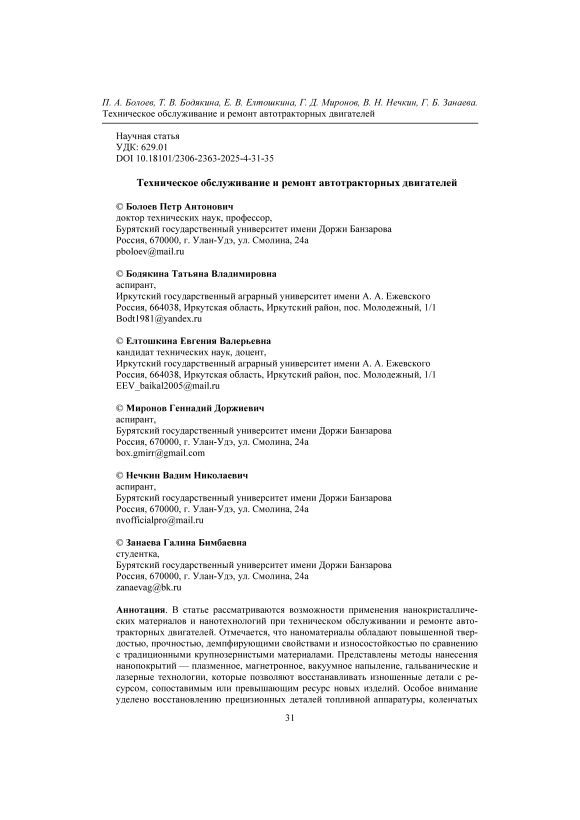 Техническое обслуживание и ремонт автотракторных двигателей / П. А. Болоев, Т. В. Бодякина, Е. В. Елтошкина, Г. Д. Миронов, В. Н. Нечкин, Г. Б. Занаева // Вестник Бурятского государственного университета. Химия. Физика. 2025. Вып. 4. С. 31– 35.