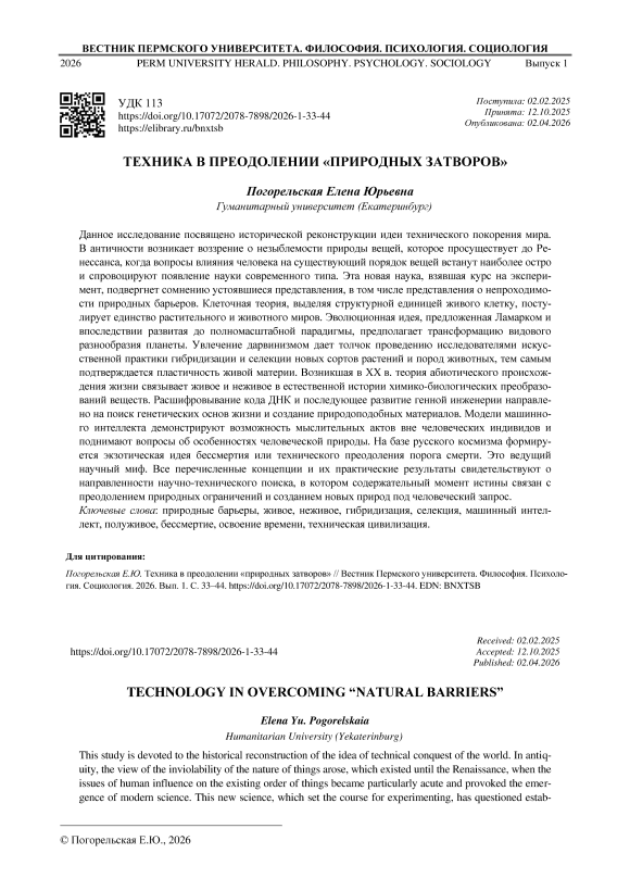 Данное исследование посвящено исторической реконструкции идеи технического покорения мира. В античности возникает воззрение о незыблемости природы вещей, которое просуществует до Ренессанса, когда вопросы влияния человека на существующий порядок вещей встанут наиболее остро и спровоцируют появление науки современного типа. Эта новая наука, взявшая курс на эксперимент, подвергнет сомнению устоявшиеся представления, в том числе представления о непроходимости природных барьеров. Клеточная теория, выделяя структурной единицей живого клетку, постулирует единство растительного и животного миров. Эволюционная идея, предложенная Ламарком и впоследствии развитая до полномасштабной парадигмы, предполагает трансформацию видового разнообразия планеты. Увлечение дарвинизмом дает толчок проведению исследователями искусственной практики гибридизации и селекции новых сортов растений и пород животных, тем самым подтверждается пластичность живой материи. Возникшая в XX в. теория абиотического происхождения жизни связывает живое и неживое в естественной истории химико-биологических преобразований веществ. Расшифровывание кода ДНК и последующее развитие генной инженерии направлено на поиск генетических основ жизни и создание природоподобных материалов. Модели машинного интеллекта демонстрируют возможность мыслительных актов вне человеческих индивидов и поднимают вопросы об особенностях человеческой природы. На базе русского космизма формируется экзотическая идея бессмертия или технического преодоления порога смерти. Это ведущий научный миф. Все перечисленные концепции и их практические результаты свидетельствуют о направленности научно-технического поиска, в котором содержательный момент истины связан с преодолением природных ограничений и созданием новых природ под человеческий запрос.