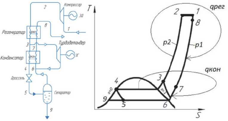 Газ сжимается в компрессоре (линия 1 – 2), затем поступает в теплообменник–регенератор, где охлаждается не сконденсировавшимся газом (линия 2 – 3). После регенератора газ разделяется на два потока. Большая часть газа направляется в турбодетандер, в котором расширяется до давления порядка 0,1 МПа с производством внешней работы. В идеальном случае процесс расширения является адиабатным, в действительности происходит увеличение энтропии (процесс 3 – 6). Расширившийся газ подается в трубки конденсатора, где охлаждает и сжижает оставшуюся часть сжатого газа в количестве (1–М) кг, проходящего в межтрубном пространстве. Конденсация этой части газа протекает по линии 3 – 4. Сжиженный газ из конденсатора через дроссельный вентиль дросселируется до давления 0,1 МПа (линия 4 – 5) и поступает в сепаратор. Образующиеся при дросселировании пары газа смешиваются с потоком газа из турбодетандера и через трубки конденсатора и поступают в регенератор, охлаждая газ высокого давления. При этом этот поток газа нагревается практически до первоначальной температуры Т1 по линии 6-7-8 постоянного давления Р1, после чего удаляется в окружающую среду (если это воздух) или обратно в резервуар.