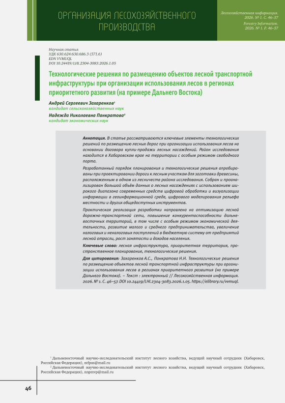 Технологические решения по размещению объектов лесной транспортной инфраструктуры при организации использования лесов в регионах приоритетного развития (на примере Дальнего Востока)
