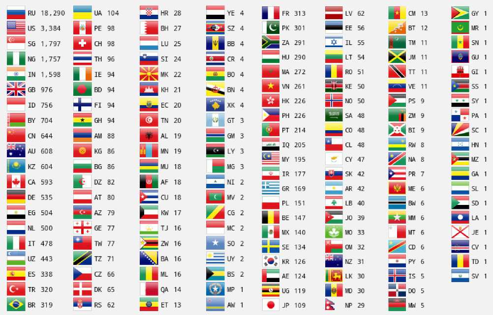 Рис. 1. География посетителей сайта журнала Journal of Digital Technologies and Law (162 страны по состоянию на 20 декабря 2024 г.)