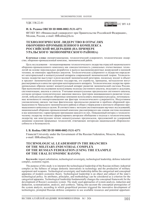 The purpose of this study is to interpret the technological leadership of the Russian military-industrial complex as the fullness of unique domestic innovations in technology and the production of military equipment and weapons. Technological sovereignty and leadership define the categorical and conceptual apparatus of modern economic theory. Technological leadership is an object and subject of the state’s technological policy. Its attributes, principles, and methodology can be considered as a criterion for the categorical apparatus. Technological leadership fundamentally changes the conceptual framework for the development of Russia’s economic system. The study used approaches of system analysis, induction and deduction, systematization, analysis, and synthesis. Taking into account the conceptual prerequisites of the system analysis, according to which geopolitical pressure triggered the innovative development of technologies, prompted Russian defense companies to use available resources and potential opportunities to replace imports as a factor of technological sovereignty. The inductive reasoning connected the particular factual prerequisites for the development and problems of the defense industry of the Ural Economic Region and the general statement in the context of the military-industrial complex as a whole. In accordance with the method of systematization of scientific research, the national military-industrial complex was considered as a single system of its components with the characteristic features of each of them. The increased interest in technological leadership made it possible to formulate the author’s generalization about the approach to technological leadership as a construction of clear conceptual prerequisites, proposals for accelerated development of breakthrough technologies that meet the interests of national defense and security.