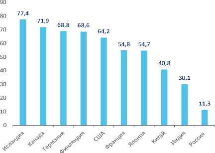 Однако в настоящее время уровень развития рассматриваемого типа предпринимательства в целом по РФ недостаточно высокий: значение основного показателя, характеризующего уровень его развития (уровень инновационной активности организаций) существенно ниже, чем в экономически развитых странах (рис. 1) .