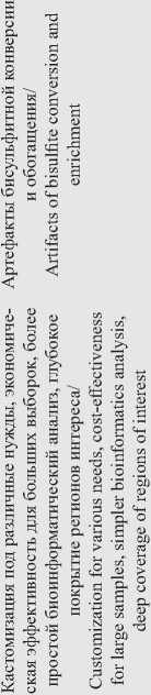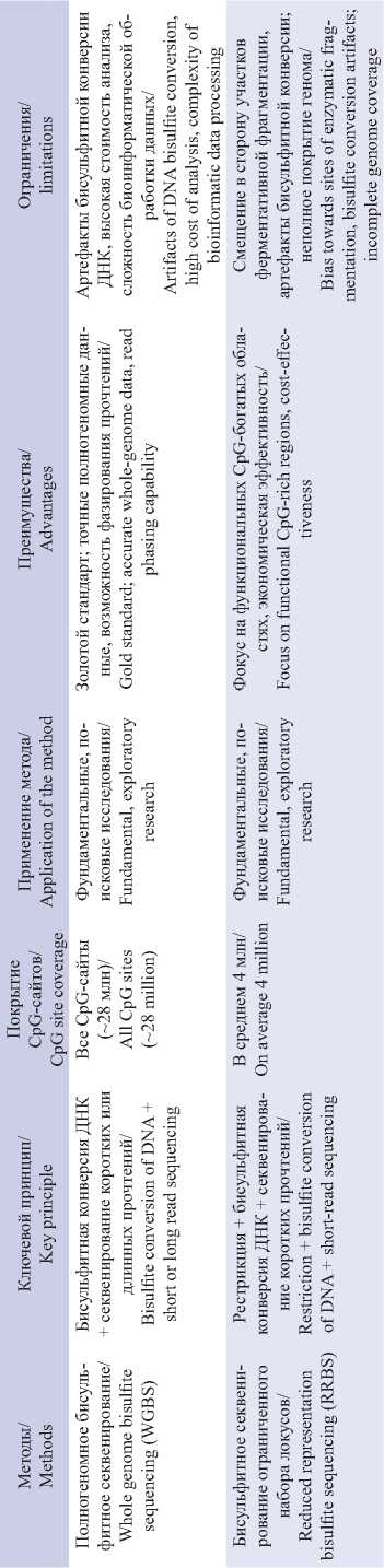 Таким образом, возможности анализа метилирования ДНК предоставлены широким спектром современных методов, каждый из которых имеет свои преимущества и ограничения (табл. 1). Развитие отдельных этапов позволяет преодолевать некоторые недостатки методов, что способствует их применению для более глубокого анализа эпигенома. Примерами таких достижений может быть уже описанная технология постбисульфитного мечения адаптерами, снижающая потери участков ДНК и увеличивающая длину вставки и скорость картирования прочтений [21], или технологии энзиматической конверсии, способствующие более полному преобразованию модифицированных оснований и сохраняющие длинные фрагменты ДНК. Отдельно стоит отметить развитие на-нопорового секвенирования, точность которого изначально составляла около 70 – 80 %, но с совершенствованием технологий достигла уровня методов массового параллельного секвенирования [22], обладая преимуществом в сборке геномов и фазировании генотипов. Несмотря на значительные преимущества, ключевым ограничением всех методов анализа геномного профиля метилирования является их высокая стоимость. В связи с этим для глубокого анализа конкретных геномных регионов необходимо таргетное обогащение.