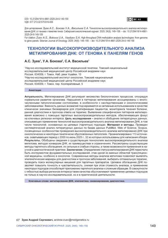 Актуальность. Метилирование ДНК регулирует множество биологических процессов, опосредуя нормальное развитие организма. Нарушения в паттернах метилирования ассоциированы с многочисленными патологическими состояниями, в особенности с наследственными и онкологическими заболеваниями. Важность данных аномалий подчеркивается их активным использованием в качестве клинически значимых биомаркеров для стратификации пациентов, мониторинга течения болезни, ранней диагностики и прогноза ответа на терапию. Выявление специфических паттернов метилирования возможно с помощью таргетных высокопроизводительных методов, обеспечивающих фокус на ключевых регионах интереса. Цель исследования – анализ и обобщение литературных данных, описывающих применение технологий высокопроизводительного анализа метилирования ДНК, в том числе технологий, основанных на целевых (таргетных) подходах. Материал и методы. Проведен систематический анализ литературных данных по базам данных PubMed, Web of Science, Scopus, посвященных особенностям проведения высокопроизводительного анализа метилирования ДНК при онкологических и некоторых генетически обусловленных патологиях. Проанализировано 113 источников, охватывающих период с 2000 по июнь 2025 г., 32 из которых использованы для написания обзора. Результаты. Обобщены сведения о существующих технологиях высокопроизводительного анализа метилома, методах конверсии ДНК, их преимуществах и ограничениях. Рассмотрены существующие методы таргетного обогащения, их сильные и слабые стороны, а также возможности применения в научной и диагностической практике. Заключение. Определение статуса метилирования ДНК перестало быть инструментом фундаментальных исследований, став одной из важных областей трансляционной медицины, особенно в онкологии. Современные методы анализа метилома позволяют выявлять эпигенетические маркеры для диагностики и прогноза заболеваний, выбирать оптимальную терапию, проводить поиск молекулярных мишеней для таргетных препаратов. Целевое обогащение ДНК позволяет повысить точность и чувствительность, снижая при этом стоимость анализа, а применение некоторых подходов способствует приложению таргетного анализа к сложным образцам. В совокупности с гибкостью выбора регионов интереса такие качества обусловливают применение целевых подходов не только в научно-исследовательской, но и в практической деятельности.