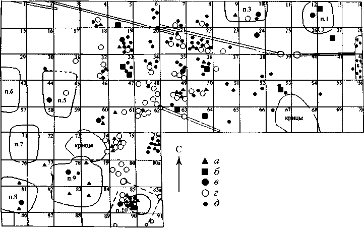 Рис. 2. Картографирование находок производственного сброса на плане Ризоположенского VI раскопа в Суздале 1991 и 2001 гг.