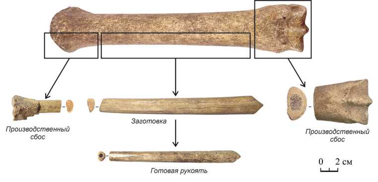 Технология изготовления цельных костяных рукоятей включала следующие этапы. После отбора подходящего исходного сырья дистальный эпифиз кости удаляли (рис. 3). Эта процедура позволяла мастеру оценить толщину компактного вещества костяной трубки и определить ее пригодность для создания рукояти. Если кость соответствовала требованиям, то ее раскалывали на две части с сохранением проксимального эпифиза. Вероятно, полученные половины могли подвергаться дополнительной обработке топором, в ходе которой удалялись сколы, а также излишнее пористое вещество.