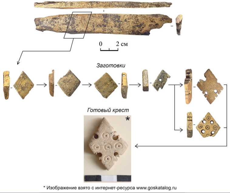Процесс их изготовления начинался с создания пластин из костных трубок, которые затем распиливали на небольшие ромбовидные заготовки. На начальном этапе в верхней части заготовки высверливали ушко для подвешивания, после чего на поверхность мог наноситься кружковый (циркульный) орнамент. Затем по четырем сторонам будущего креста делали сквозные отверстия, которые после обработки ножом приобретали форму лопастей и стилизовались в виде крина (рис. 4).