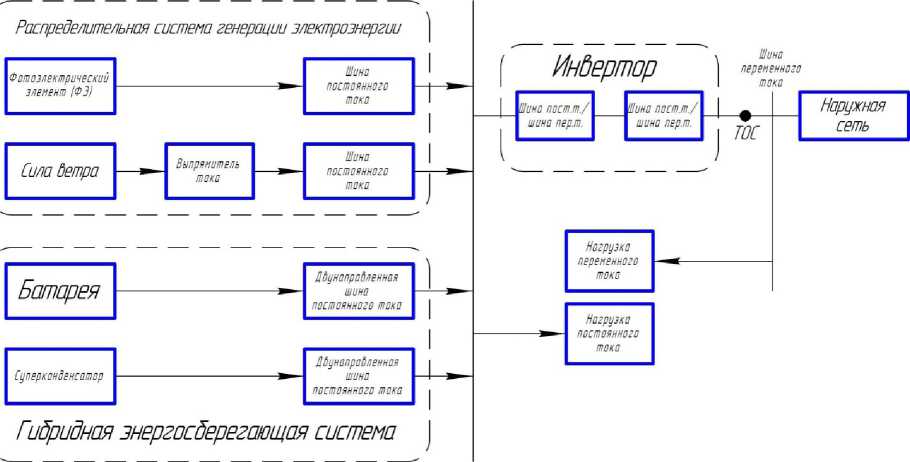 На схеме (рис. 1) показана гибридная система накопления энергии, работающая на ветровой и солнечной энергии. В состав системы включены ветрогенераторы, инверторы, шины постоянного и переменного тока, солнечная панель и устройство накопления энергии. В распределённой системе генерации электроэнергия сначала поступает на шину постоянного тока, а затем преобразуется в переменный ток с использованием инвертора. Система накопления управляет распределением энергии, обеспечивая стабильное электроснабжение как потребителей, так и сетей [8].