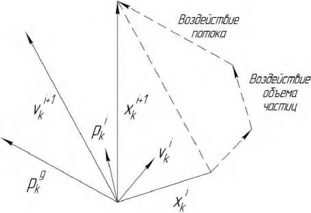 В соответствии с источником [5] алгоритм оптимизации потока частиц работает следующим образом: рассмотрим K–мерное пространство поиска, в котором количество частиц равно n , а положение и скорость частицы под номером i равны xi = (x1i, x2i,…, xki), Vi = (V1i, V2i,…, Vki) . Затем скорость и положение частиц обновляются, как показано на рис. 4.