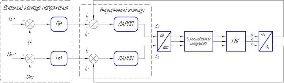 Входными значениями являются команда напряжения на стороне постоянного тока UC * и команда напряжения в точке общего соединения (ТОС) UPCC *, которые генерируют опорные сигналы для текущего внутреннего контура. На рис. 3 два опорных сигнала соответствуют двум напряжениям на внешнем кольце и линейному активному регулятору подавления помех (ЛАРПП) на внутреннем кольце. На выходе устройства подается импульсный сигнал напряжения [12].