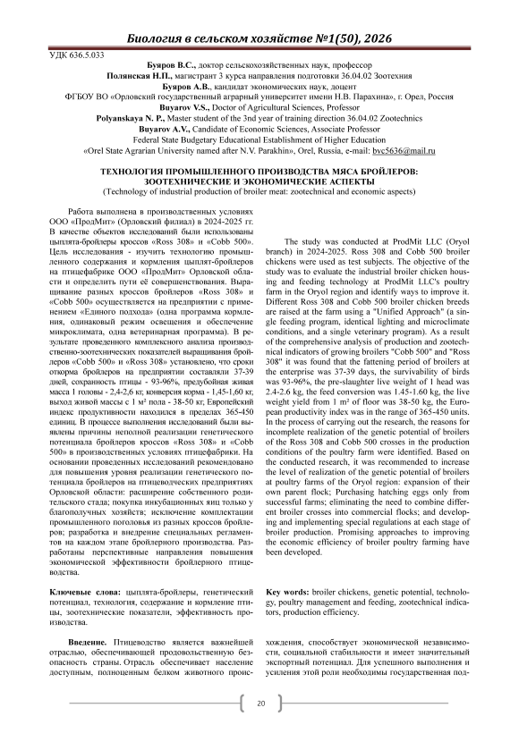 Работа выполнена в производственных условиях ООО «ПродМит» (Орловский филиал) в 2024-2025 гг. В качестве объектов исследований были использованы цыплята-бройлеры кроссов «Ross 308» и «Cobb 500». Цель исследования изучить технологию промышленного содержания и кормления цыплят-бройлеров на птицефабрике ООО «ПродМит» Орловской области и определить пути её совершенствования. Выращивание разных кроссов бройлеров «Ross 308» и «Cobb 500» осуществляется на предприятии с применением «Единого подхода» (одна программа кормления, одинаковый режим освещения и обеспечение микроклимата, одна ветеринарная программа). В результате проведенного комплексного анализа производственно-зоотехнических показателей выращивания бройлеров «Cobb 500» и «Ross 308» установлено, что сроки откорма бройлеров на предприятии составляли 37-39 дней, сохранность птицы 93-96%, предубойная живая масса 1 головы 2,4-2,6 кг, конверсия корма 1,45-1,60 кг, выход живой массы с 1 м² пола 38-50 кг, Европейский индекс продуктивности находился в пределах 365-450 единиц. В процессе выполнения исследований были выявлены причины неполной реализации генетического потенциала бройлеров кроссов «Ross 308» и «Cobb 500» в производственных условиях птицефабрики. На основании проведенных исследований рекомендовано для повышения уровня реализации генетического потенциала бройлеров на птицеводческих предприятиях Орловской области: расширение собственного родительского стада; покупка инкубационных яиц только у благополучных хозяйств; исключение комплектации промышленного поголовья из разных кроссов бройлеров; разработка и внедрение специальных регламентов на каждом этапе бройлерного производства. Разработаны перспективные направления повышения экономической эффективности бройлерного птицеводства.