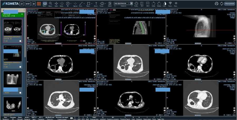 При организации и проведении ТМК по профилю «Торакальная хирургия» одним из ключевых элементов взаимодействия является возможность удалённого просмотра рентгенологических изображений. В настоящее время на территории Самарской области в рамках единой государственной системы здравоохранения функционирует Центральный архив медицинских изображений (далее – ЦАМИ) с системой просмотра «Комета», ко которому под- ключены 294 аппарата по модальностям Рентген, КТ, МРТ. По состоянию на 31.12.2025 года в ЦАМИ хранится 8 975 866 исследований. В подавляющем большинстве ТМК (132 случая / 95,6%) проведение консультации было обеспечено возможностью визуального просмотра диагностического изображе-ния/исследования в «Комете», что, безусловно, способствовало высокой доступности и качеству оценки данных (рис. 2).