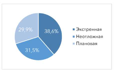 Средний возраст пациентов, в программе лечения которых была проведена ТМК, составил 55±18,1 лет. Гендерное соотношение: мужчин – 83 (60,1%), женщин – 55 (39,9%). Из 138 ТМК в формате «Врач-Врач» заочная консультация проведена у 128 пациентов (92,8%), с применением видеосвязи – у 10 пациентов (7,2%). При проведении ТМК в формате «Врач-Пациент» все 113 консультаций проведены с использованием аудиосвязи. Вид ТМК определяется формой оказания медицинской помощи с соответствующими сроками предоставления заключения: экстренная – до 2 часов, неотложная – до 24 часов, плановая – до 72 часов (рис. 3).