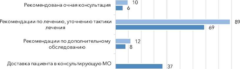 Лечебно-диагностическая тактика, рекомендованная консультантами при проведении ТМК, в форматах «Врач – Врач» и в отдельных вопросах была схожей, но, в то же время имела принципиальные отличия, связанные с целеполаганием самой консультации. Наибольшая доля приходится на рекомендации по лечению и уточнению тактики лечения – 78,8% при ТМК «Врач–Пациент» и 50% при ТМК «Врач–Врач». У 37 стационарных пациентов (26,8%) была организована последующая доставка и перевод в консультирующую МО. Рекомендации по дополнительному обследованию были назначены у 10,6% пациентов при ТМК «Врач–Пациент» и 5,8% пациентов при ТМК «Врач–Врач». Выезд специалиста в МО – заявителя ТМК был осуществлён в 12 случаях (10,6%). Назначение очной консультации произведено в 8,8% случаев при ТМК «Врач– Пациент» и 4,3% случаев ТМК «Врач–Врач».