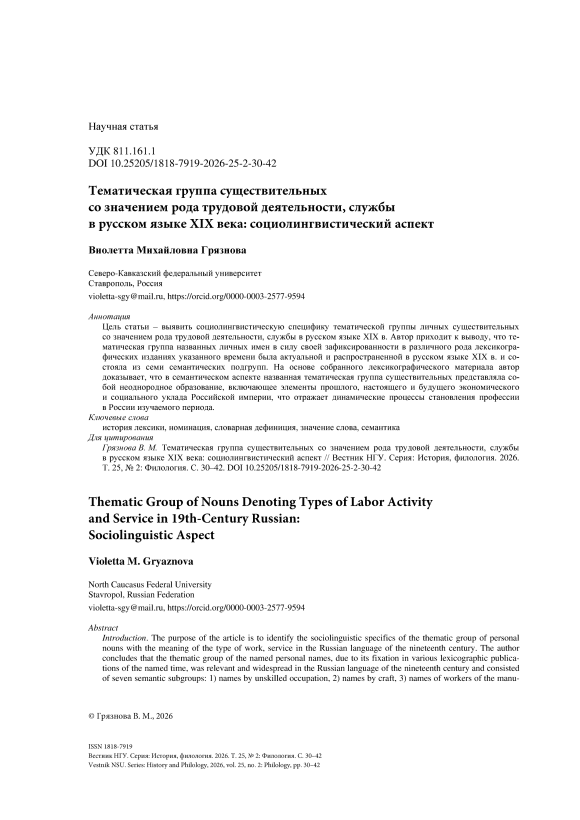 Conclusion . Based on the collected lexicographic material, the author proves that in the semantic aspect, the thematic group of nouns with the meaning of the type of work, service of a person was a heterogeneous formation, including elements of the past, present and future economic and social structure of the Russian Empire, which reflects the dynamic processes of profession formation in Russia of the studied period.