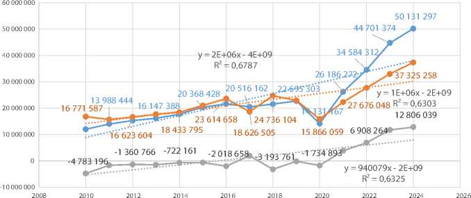 Fig. 4. Dynamics of income, expenses and profit of SKO in the North Caucasus Federal District from 2010 to 2024 (compiled by the authors according to [12)]