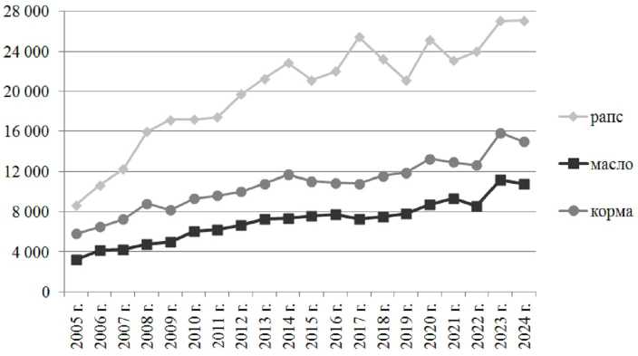 Рисунок. Динамика мирового экспорта рапса и продукции из него, тыс. т Figure. Dynamics of rapeseed and rapeseed products world export, thousand tons