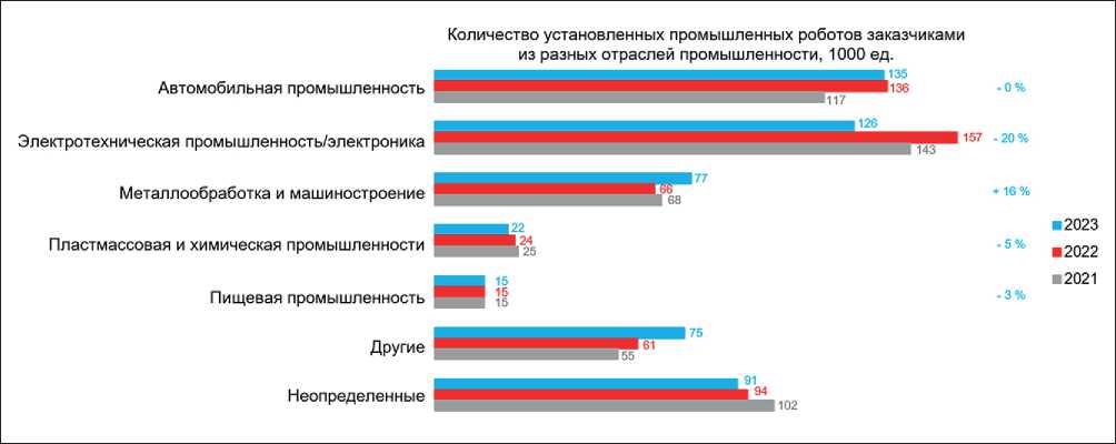 Рис. 1. Тенденция применения роботов-манипуляторов в различных отраслях с 2021 по 2023 год