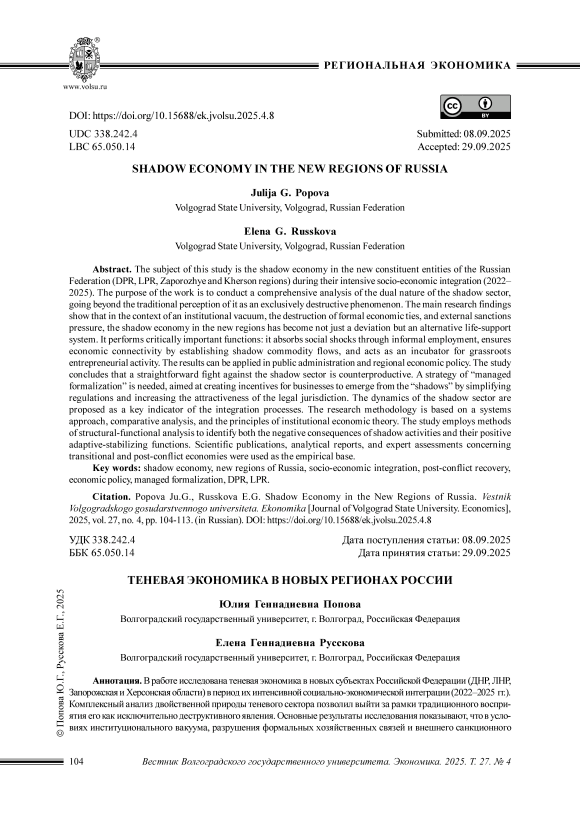 В работе исследована теневая экономика в новых субъектах Российской Федерации (ДНР, ЛНР, Запорожская и Херсонская области) в период их интенсивной социально-экономической интеграции (2022–2025 гг.). Комплексный анализ двойственной природы теневого сектора позволил выйти за рамки традиционного восприятия его как исключительно деструктивного явления. Основные результаты исследования показывают, что в условиях институционального вакуума, разрушения формальных хозяйственных связей и внешнего санкционного давления теневая экономика в новых регионах стала не только отклонением, но и альтернативной системой жизнеобеспечения. Она выполняет критически важные функции: амортизирует социальные шоки через неформальную занятость, обеспечивает экономическую связность путем налаживания теневых товарных потоков и выступает инкубатором низовой предпринимательской активности. Сделан вывод, что прямолинейная борьба с теневым сектором контрпродуктивна. Необходима стратегия «управляемой формализации», направленная на создание стимулов для выхода бизнеса из «тени» путем упрощения регулирования и повышения привлекательности легальной юрисдикции. Динамика теневого сектора предложена в качестве ключевого индикатора эффективности интеграционных процессов. Методология исследования основана на системном подходе, сравнительном анализе и принципах институциональной экономической теории. В работе применяются методы структурнофункционального анализа для выявления как негативных последствий теневизации, так и ее позитивных адаптивностабилизирующих функций. В качестве эмпирической базы использованы научные публикации, аналитические доклады и экспертные оценки, касающиеся переходных и постконфликтных экономик.
